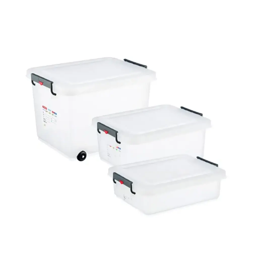 De container is voorzien van een goed afsluitbare deksel, die stevig vastgezet wordt met beugels. Dit garandeert niet alleen een veilige afsluiting tegen vuil en vocht, maar draagt ook bij aan het behoud van hygiëne en voedselkwaliteit.