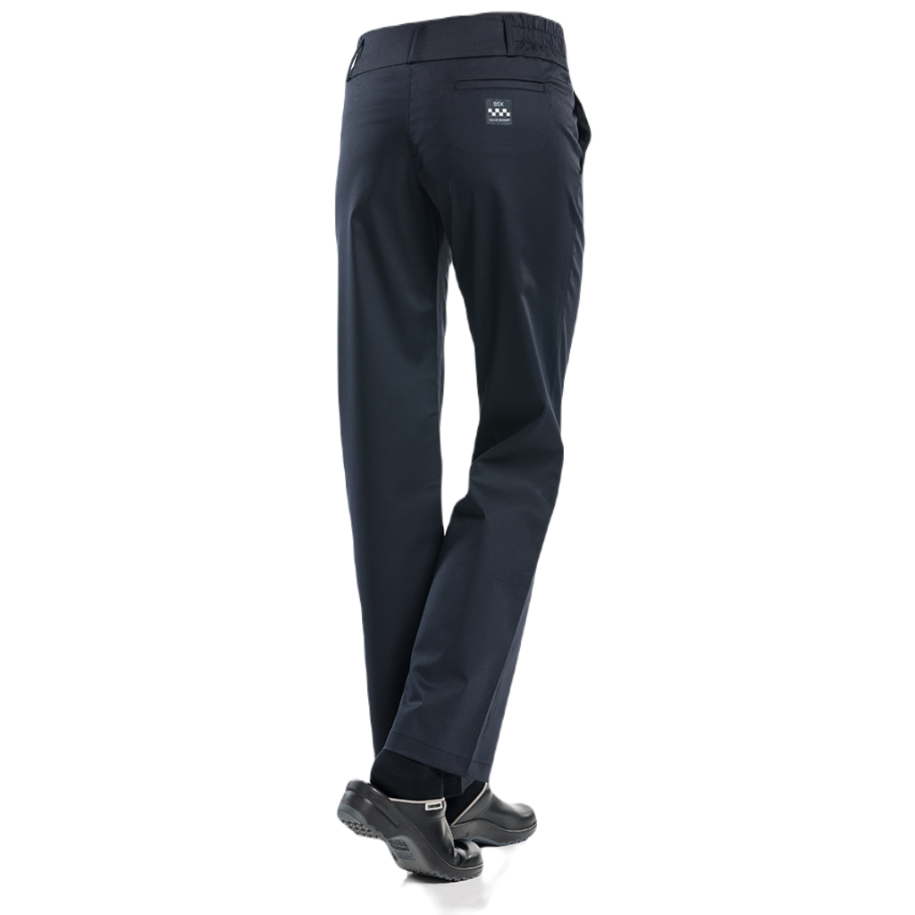 Deze zeer prettige Low Waist Fit broek met een lage heup en een brede band met elastiek aan beide zijden maakt deel uit van onze BSX-collectie. De zwarte stof maakt dit dan ook een uitstekende 'basic' damespantalon die goed combineert met alle jasjes.