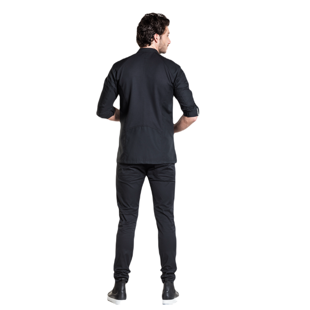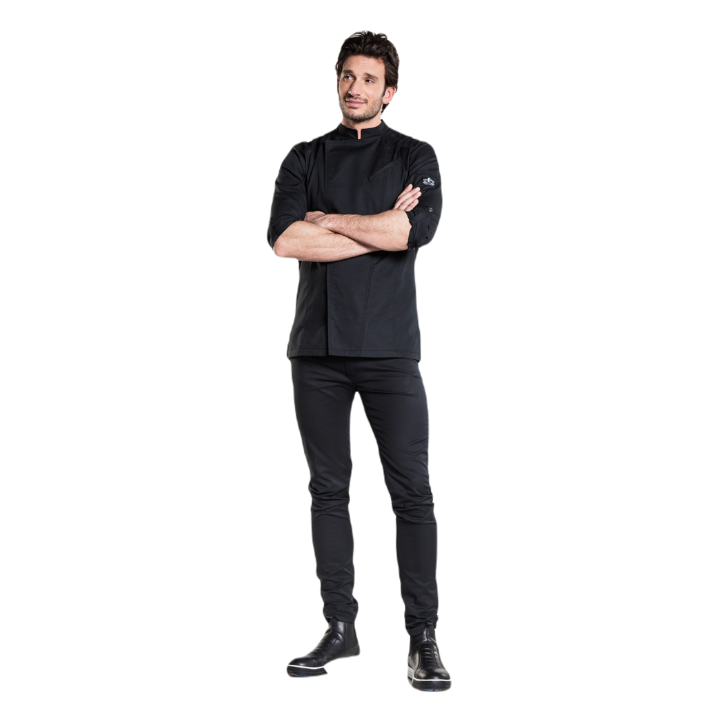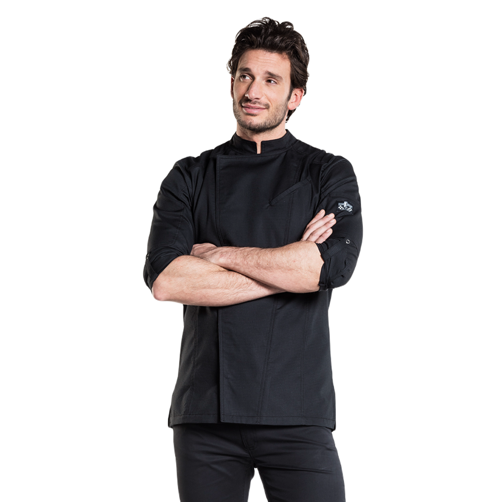 Deze koksbuis is geïnspireerd op onze stoere Biker en heeft een verdekte sluiting met drukknopen. Wat opvalt aan deze jas is de wafelstof, die voor een ruige, authentieke look zorgt. Voor extra verkoeling kun je je mouwen opstropen en met een handige loop vastzetten. Bijzonder comfortabel aan deze jas zijn de luchtige jersey achterpanden. De zwarte kleur past bij het stoere karakter van deze koksbuis.