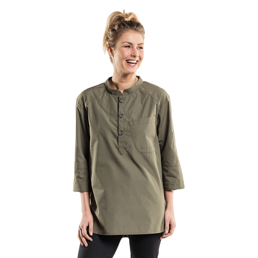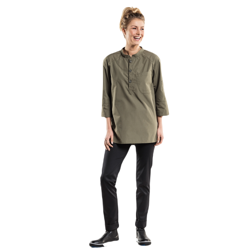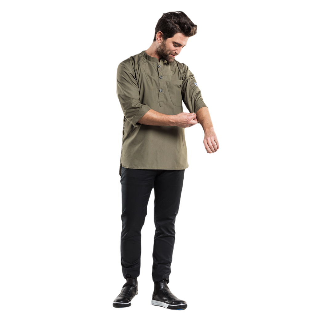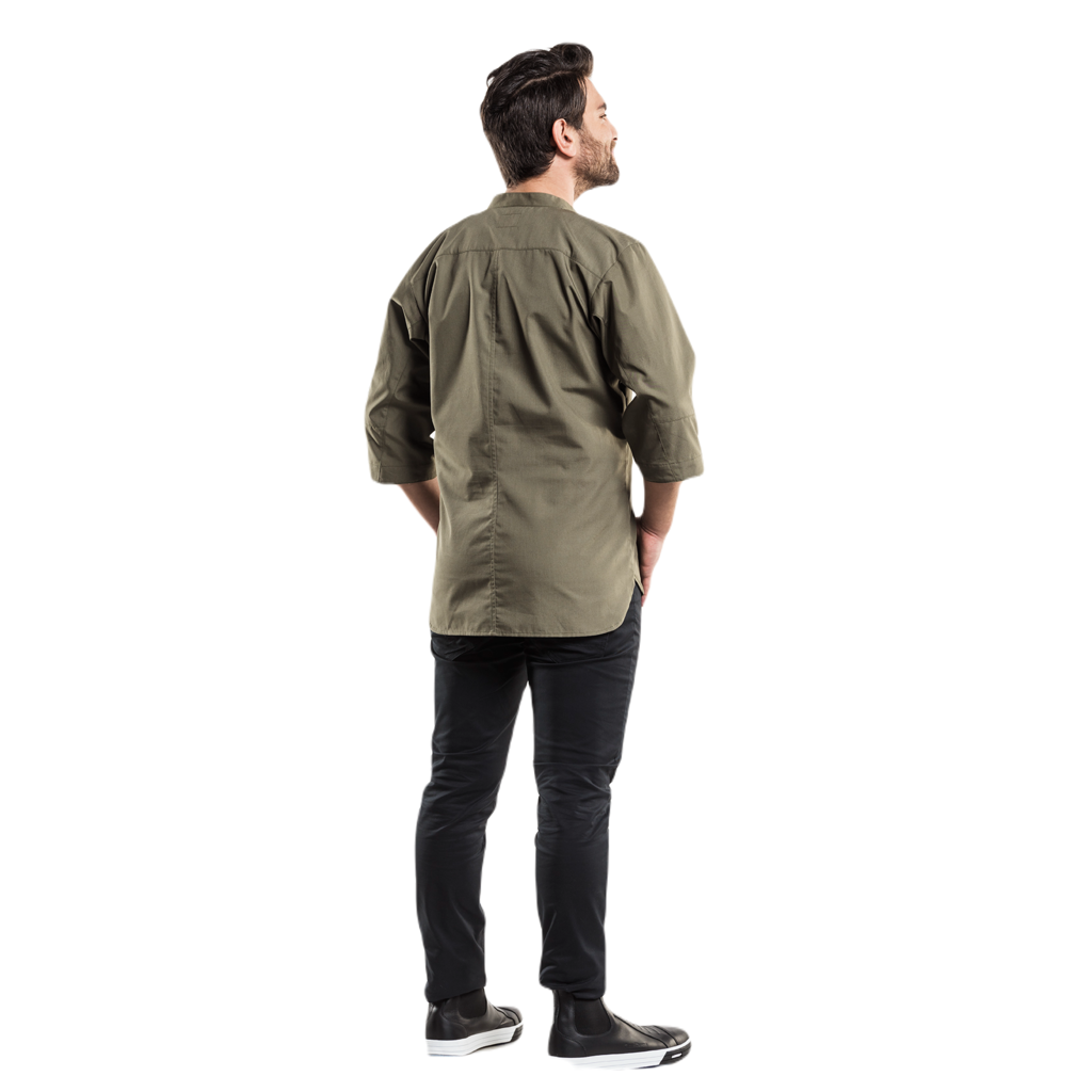 De Bujutsu doet het allemaal nét even anders. Het is een speelse, eigentijdse jas met karakter. In tegenstelling tot gewone koksbuizen trek je deze jas over je hoofd aan. Het is de asymmetrische borstzak die de Bujutsu lekker dwars maakt. De groene kleur is uniek in de keuken en zal zeker indruk maken.