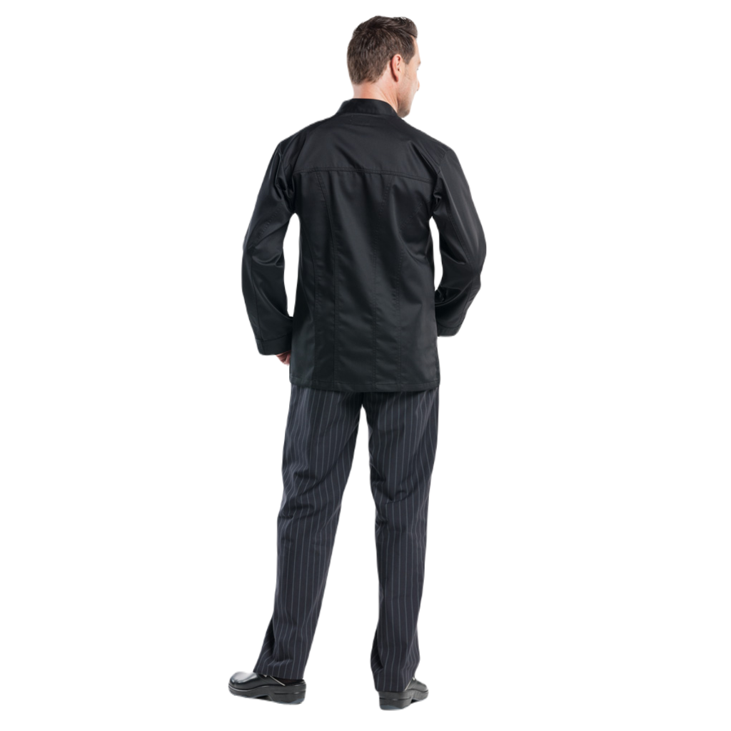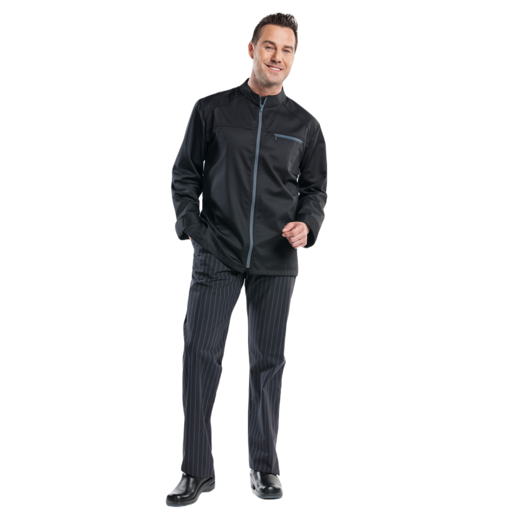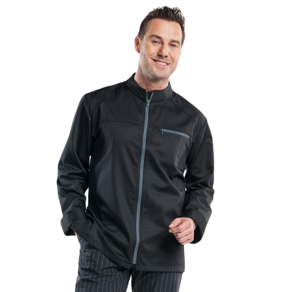 De Modena is een strakke, stoere koksbuis, afgewerkt met contrasterende ritsen. De buis heeft een borstzakje met rits en valt op door zijn elegante eenvoud. Een perfecte combinatie van functionaliteit en uitstraling.