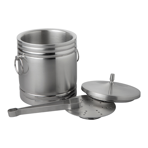 Dubbelwandige ijsblokjesemmer van roestvrijstaal 18/8. Wordt geleverd inclusief ijsblokjestang.