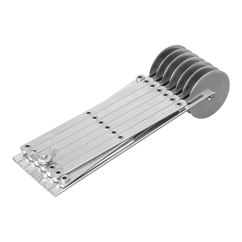 Zware kwaliteit Jan Hagel snijder met 7 gladde ø 55 mm roestvrijstalen snijwielen. De snijdikte kan eenvoudig aangepast worden. Maximale 12,5 cm afstand tussen de wielen.