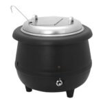 Met roestvrijstalen binnenpot en klapdeksel. De buitenwans is van zwart hittebestendig kunststof. Voorzien van een opvangrand voor gemorste druppels. Thermostatisch instelbaar en voorzien van controle lampje. Soepketel kan uitsluitend nat worden gebruikt. Wordt geleverd inclusief opscheplepel.