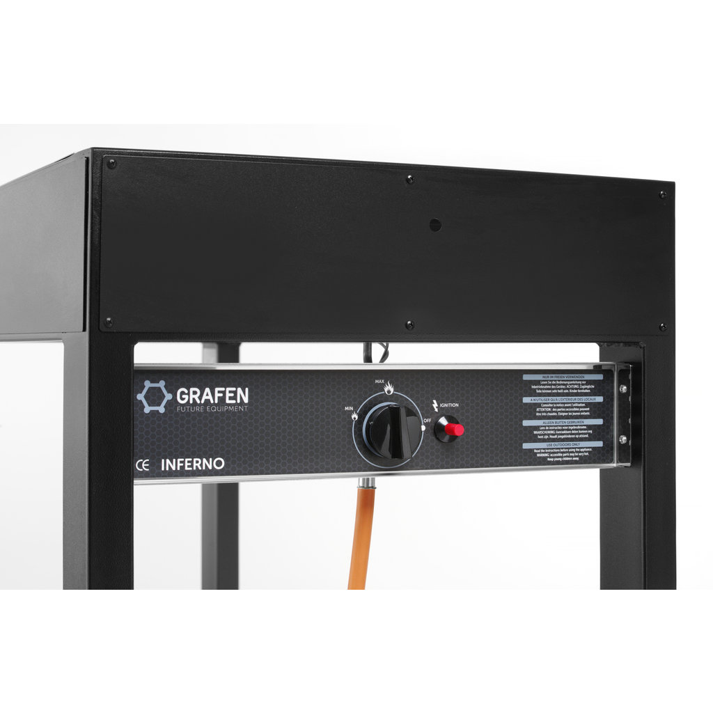 Het brandersysteem is volledig gemaakt van roestvast staal en kan volledig worden gedemonteerd voor eenvoudige reiniging. De enkele in de lengte geplaatste brander is instelbaar, heeft thermokoppelbeveiliging en een piëzo-ontsteking. De Inferno heeft een geheel zwart epoxy gecoat frame met vier wielen, waarvan twee zwenkwielen, en een veilige gasfleshouder.