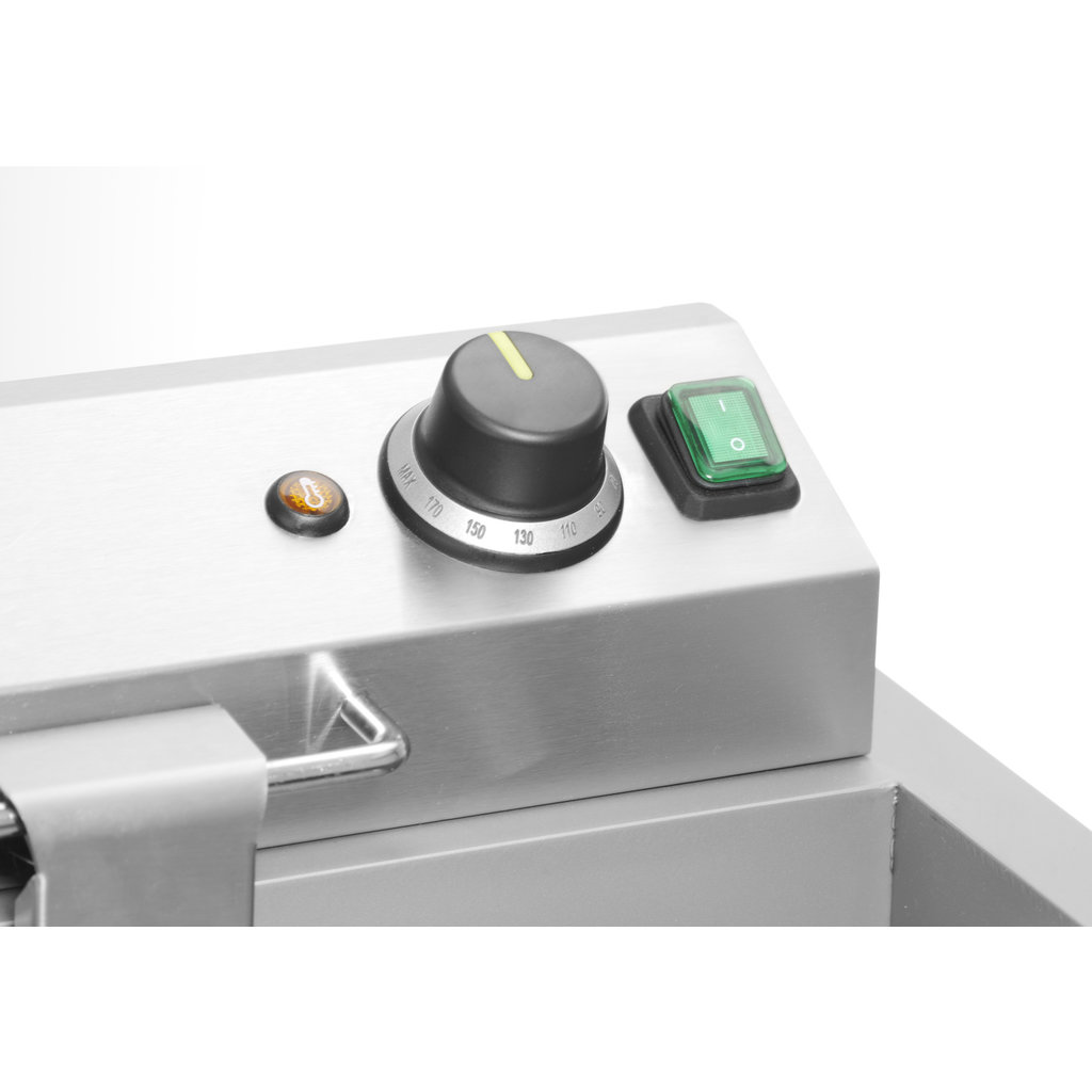 Uitgerust met een grote gelaste olietank (400x400x(H)160 mm) met een maximale capaciteit van 12 liter. Tank uitgerust met aftapkraan en min/max oliepeilmarkeringen, heeft een koude zone om de gebruikstijd van olie te verbeteren. Verwisselbaar verwarmingselement met uitschakelfunctie bij verwijderen en bescherming tegen oververhitting.