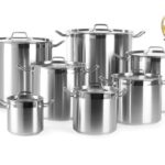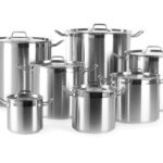 Alle deksels zijn gemaakt van 1 mm roestvast staal met stoomopeningen. Dikke sandwichbodem (roestvast staal/aluminium/roestvast staal) combineert de warmteverspreidende eigenschappen van aluminium met de duurzaamheid en magnetische eigenschappen van roestvast staal, waardoor het geschikt is voor gebruik op inductiekookplaten.