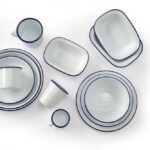 Geëmailleerd servies is helemaal terug van weggeweest. Wit geëmailleerd staal met een mooi blauw randje. Hoge kwaliteit emaille en slijtvast. Hittebestendig tot 350°C en het servies mag in de vaatwasser.