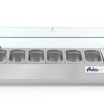 Met 4 verstelbare kunststof antislipvoetjes. Temperatuurbereik: -2°C tot +8°C. Klimaatklasse: SN. Koelmiddel: R600a. Alle modellen worden geleverd zonder GN-bakken. Met gehard glazen display. Koelvitrine voor GN 1/4 bakken met een maximale hoogte van 150 mm.