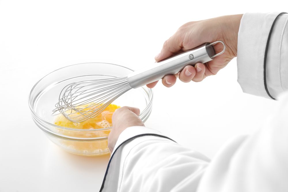 Roestvrijstalen garde met 12 flexibele piano draden van 1,4 mm dik. De garde is voorzien van een ophangoog en is vaatwasmachine geschikt.