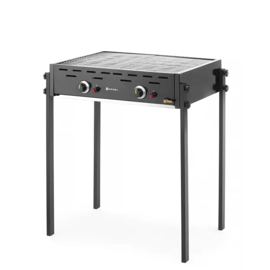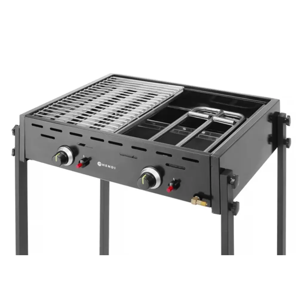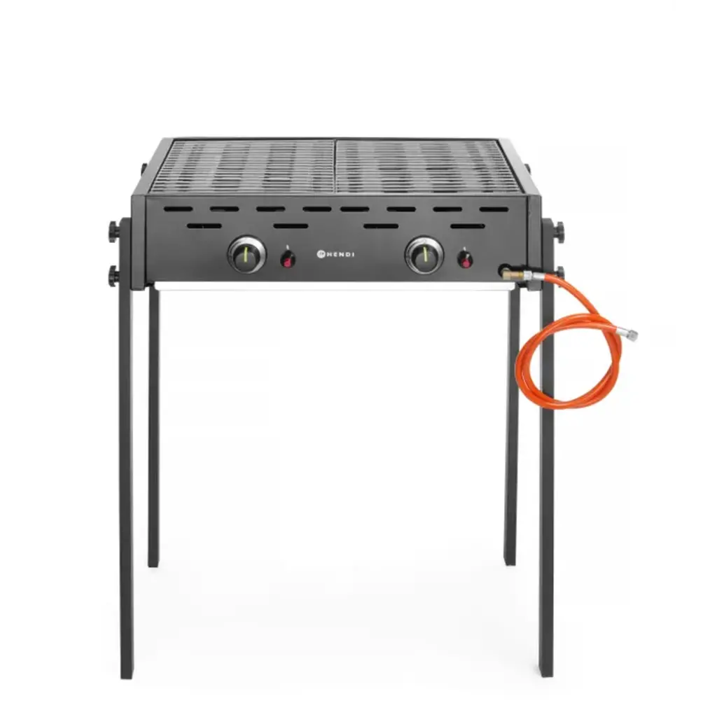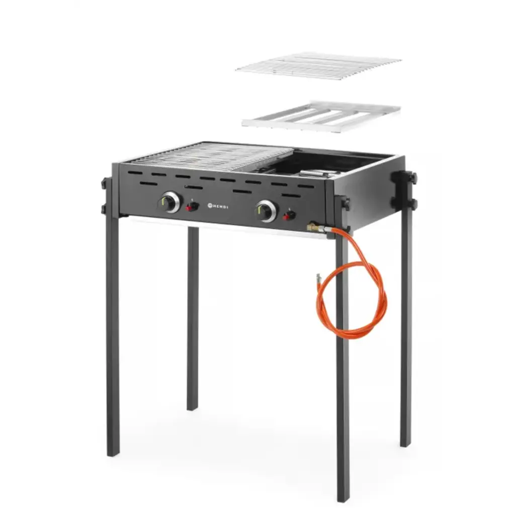 Behuizing gemaakt van roestvrijstaal afgewerkt met zwart email. Voorkant en 4 poten gemaakt van roestvrijstaal afgewerkt met zwarte poedercoating. Voorzien van twee onafhankelijke gasbranders met een piëzo-ontsteking, twee vlamverdelers gemaakt van roestvrijstaal en twee verchroomde stalen roosters van 470x320 mm.