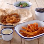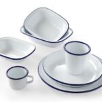 Geëmailleerd servies is helemaal terug van weggeweest. Wit geëmailleerd staal met een mooi blauw randje. Hoge kwaliteit emaille en slijtvast. Hittebestendig tot 350°C en het servies mag in de vaatwasser.