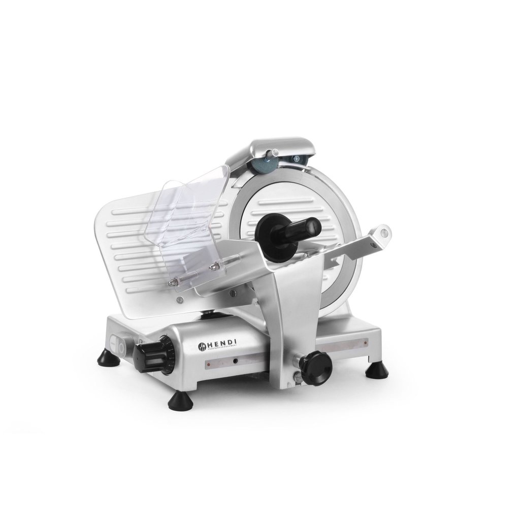 Bestemd voor professioneel commercieel gebruik. Behuizing van gecoat aluminium voorzien van non-slip voetjes. Schuingeplaatst gehard roestvrijstalen mes met groot koppel. Luchtgekoelde motor is voorzien van beveiliging tegen oververhitting. Motor heeft een extra hoog vermogen voor het snijden van harde vleeswaren.