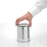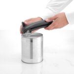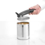 Deze veilige blikopener maakt geen scherpe randjes aan het deksel of blik en staat toe het deksel terug te plaatsen op het blik. Het mechanisme snijdt het blik open aan de zijkant net beneden het deksel.