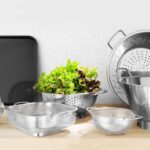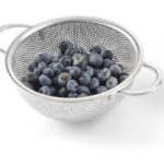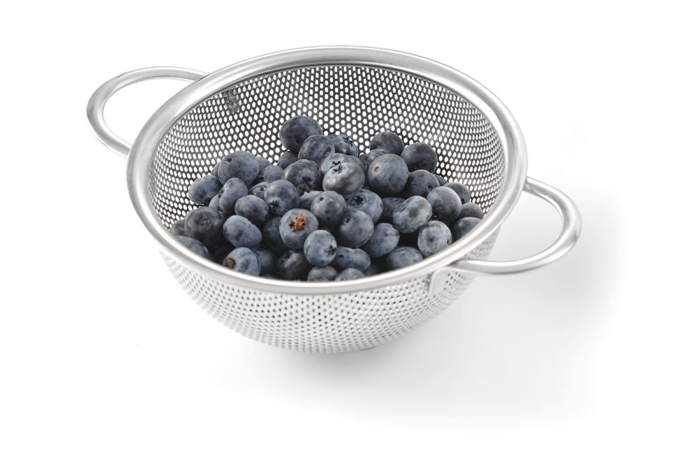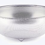 Roestvrijstalen vergiet met voet en twee handgrepen.