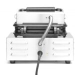 Brusselse wafels, twee 3×5 rechthoekige patronen. Gietijzeren bakplaten met anti-aanbaklaag. Thermostatische temperatuurregeling. Inclusief wafelvork. Geïsoleerde handgreep.