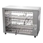 Roestvaststaal met 6 klemmen. Voorzien van 6 elementen, 2 onder, 2 midden en 2 boven. 3 afzonderlijke schakelaars en tijdklok met continustand. Boven- en onderoosters in 2 hoogtes verstelbaar en roestvaststalen kruimellade. Ook geschikt voor het opwarmen of gratineren van producten. Voorzien van afneembare achterzijde voor het eenvoudig schoonmaken. Uitneembare vaatwasmachinebestendige kruimellade. Wordt geleverd inclusief roosters en 6 (tosti) klemmen.