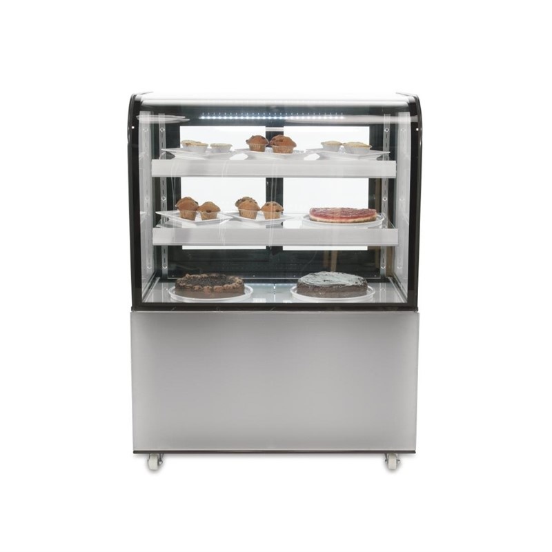 Aantrekkelijke glazen vitrine, ideaal voor het presenteren van taarten, gebak en andere verse producten. Een krachtige en betrouwbare vitrine voor cafés, broodjeszaken en delicatessenwinkels. Voesel kan hygiënisch bewaard worden achter het mooi gebogen glas en door de schuifdeuren aan de achterzijde is de vitrine eenvoudig te reinigen. De stijlvolle en efficiënte LED-verlichting zorgt voor een mooie presentatie van uw producten en moedigen impulsaankopen aan.