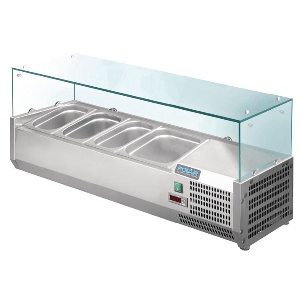 De Polar G-serie opzetkoelvitrine heeft ruimte voor tot wel 4 gastronorm bakken (3x GN 1/3 en 1x GN 1/2) en is daarmee een uitstekende keuze om ingrediënten gekoeld en hygiënisch op te slaan in kleinere broodjeszaken, pizzeria's en restaurants.
